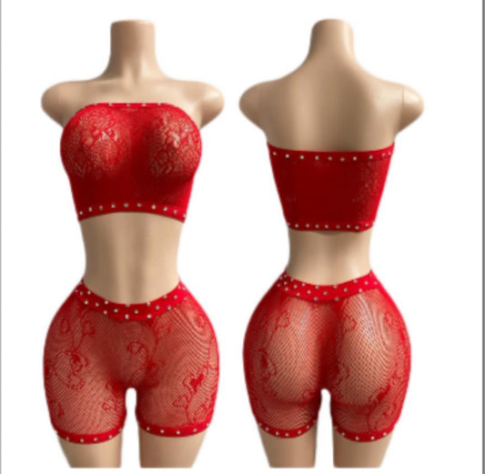 Fishnet Bandeau / Short Set with Rhinestone Trim