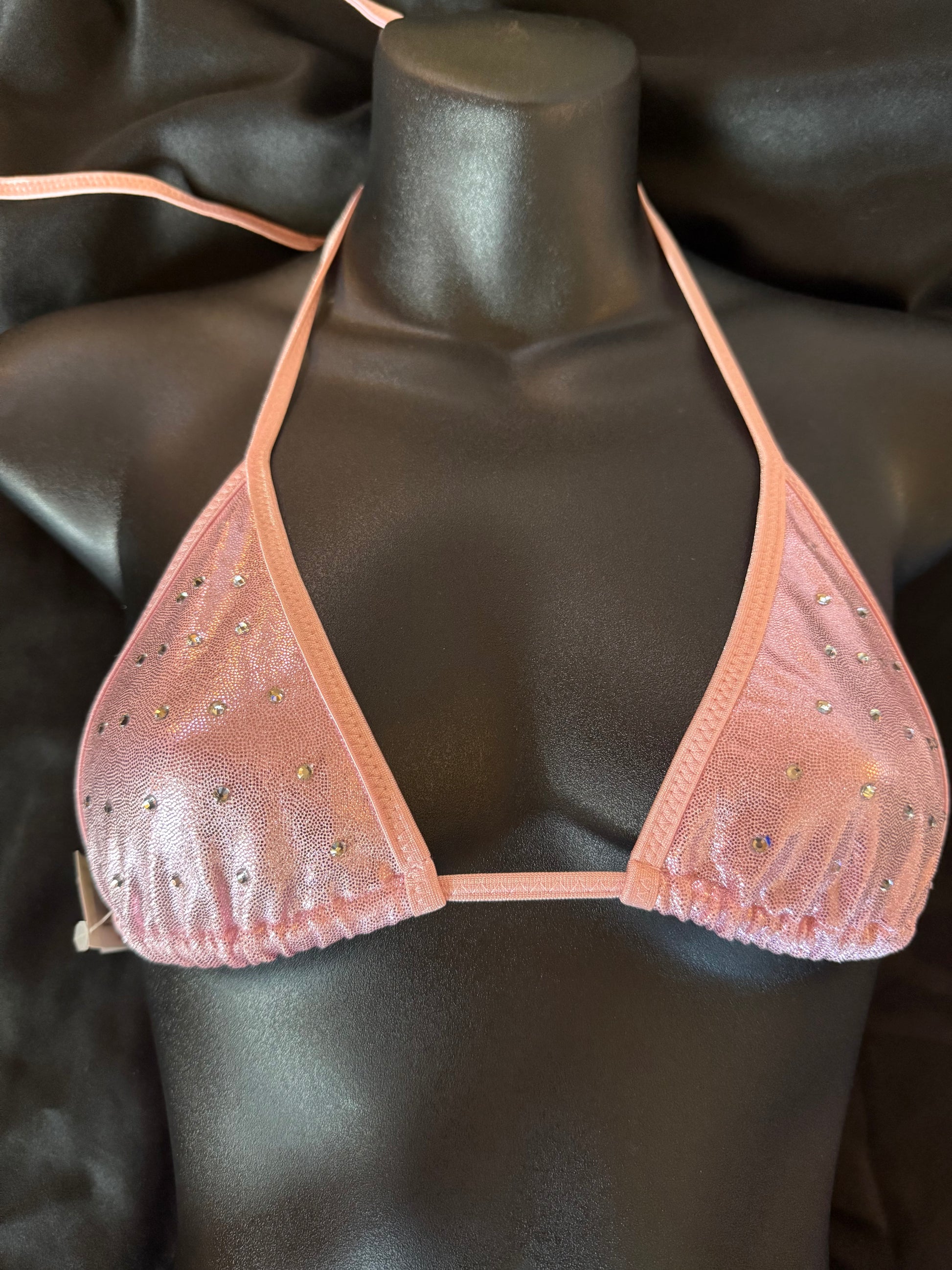 Turn heads and shine bright in this seductive rhinestone bikini top. Designed to make a statement, this bikini features triangle cups adorned with sparkling rhinestone embellishments, adding the perfect touch of glamour to your dance performance. The halter straps and tie-back closure ensure a secure and adjustable fit, giving you confidence with every move.