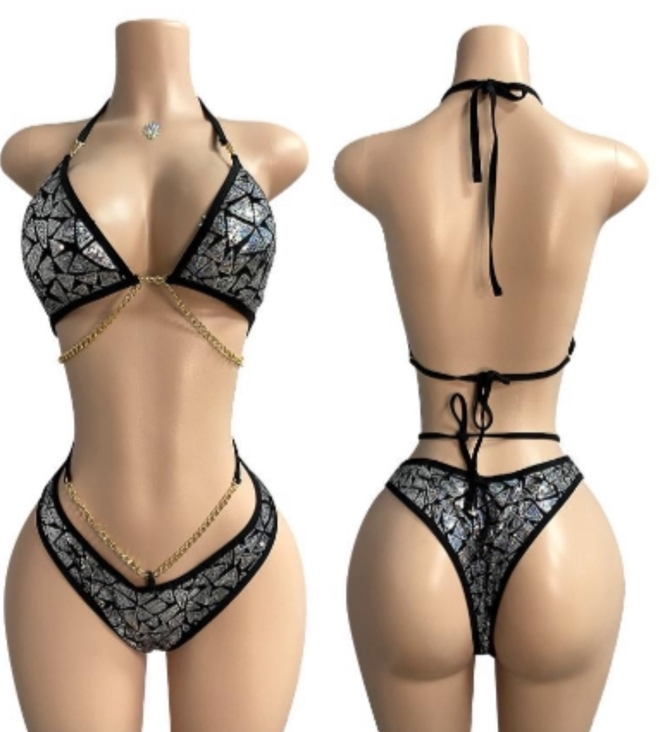Get ready to turn heads with our 2 Piece Sequin & Chains Bikini Set! Available in medium size, this black bikini features eye-catching silver hologram sequins in triangular designs, accented with gold chains for added flair. Perfect for pool parties or beach days, this set will make you the life of the party (and the envy of all your friends)!