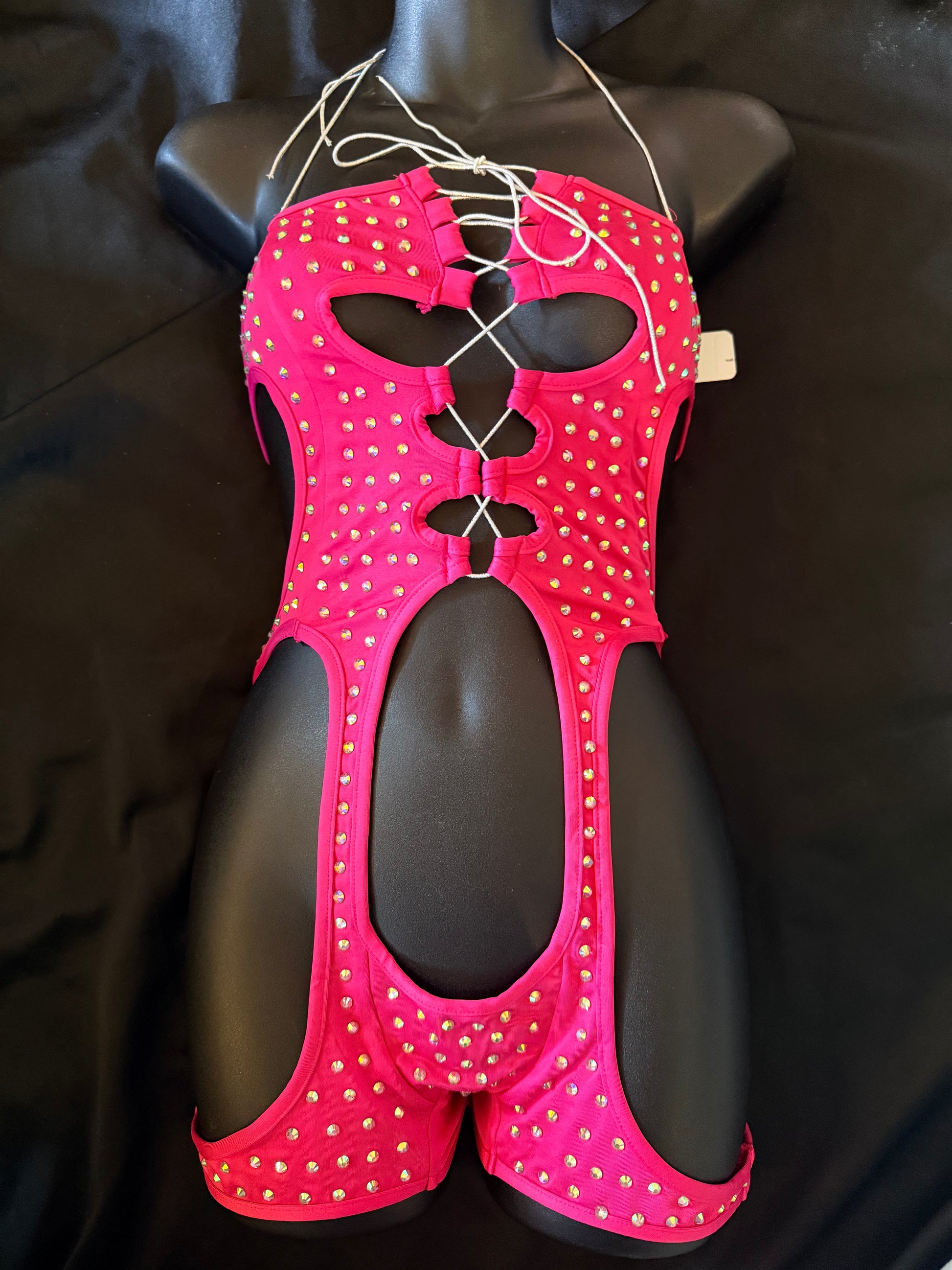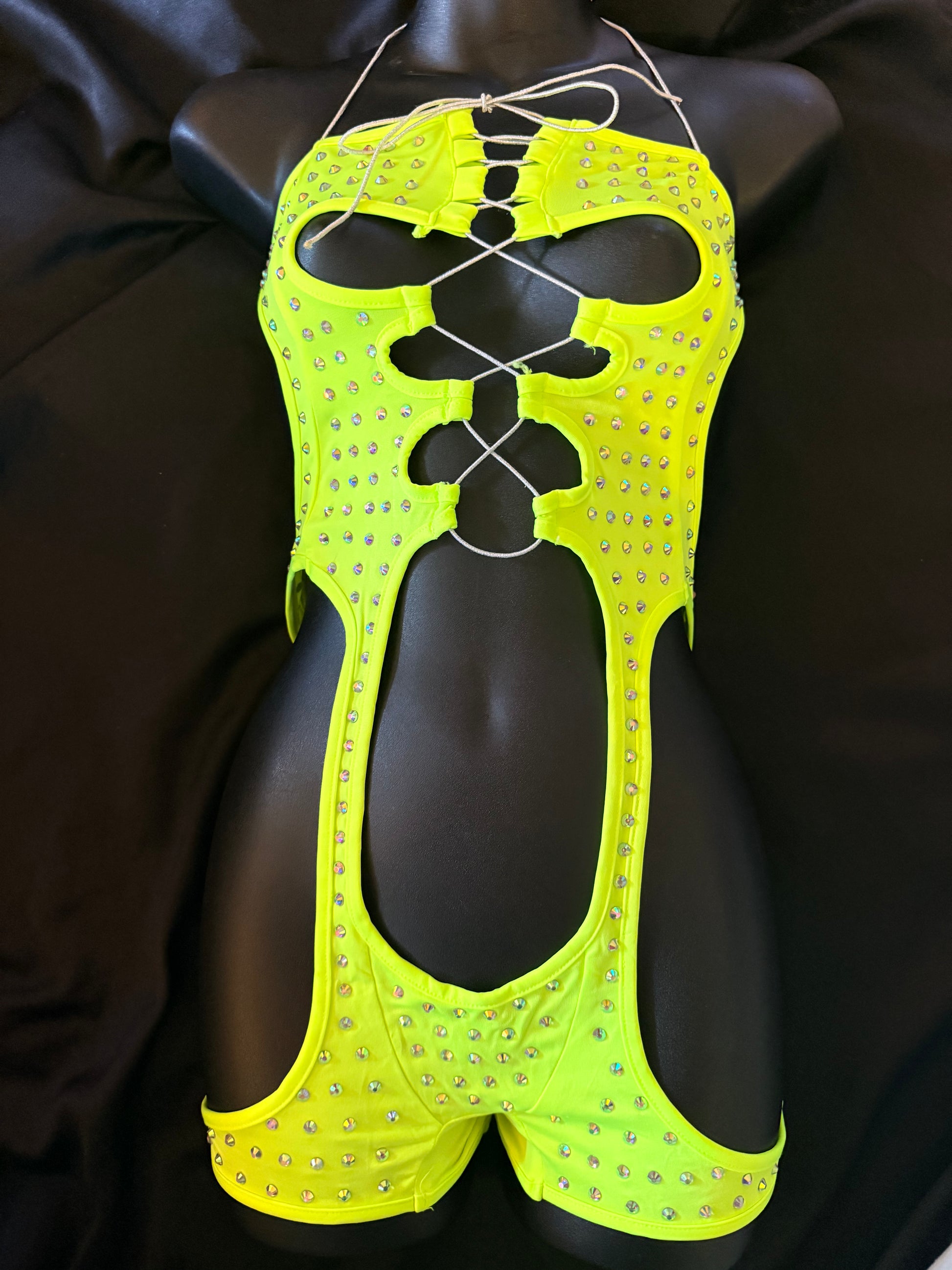 This dazzling one-size Rhinestone Thong Romper is your perfect festival and rave companion. Bedazzled with large AB color stones, it sparkles beautifully under any light. Featuring a flirty cut-out thong design with a chic cord center connector and adjustable ties, it offers a playful fit that moves with you. Turn heads and shine bright with this exotic, eye-catching outfit made to celebrate your fearless spirit.